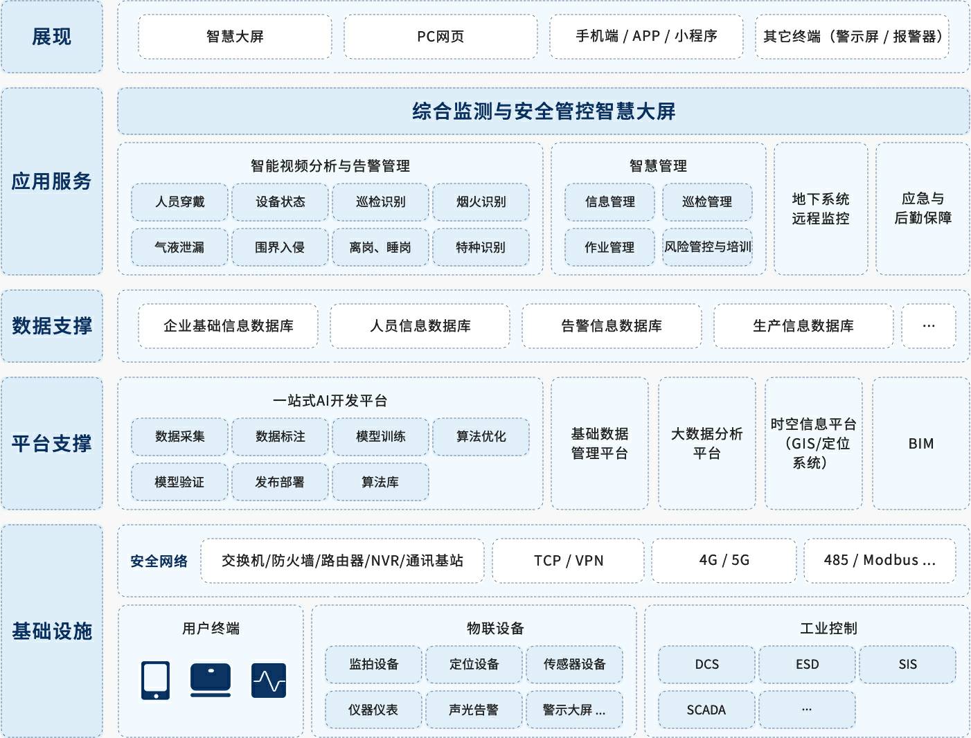 针对矿山安全生产的管理要求,紧抓需求痛点,乐鱼网页版登录入口-乐鱼(中国)创新提出“一基础、双支撑、多平台、N应用”的智慧矿山方案,实现不同阶段需求逐步实现未来智慧矿山。乐鱼网页版登录入口-乐鱼(中国)创新充分利用人工智能算法优势,从智能视频分析风险隐患切入,实现风险隐患全生命周期分析与管理,同时应用智慧化作业流程、智慧检维修提升作业生产效率,应急与后勤保障是重中之重,除了实现地下通风系统、定位系统、电力系统、通讯系统、排水系统以及环境监测系统的全天候监控之外,应急物资管理系统保障物资及时可用,人员设备定位系统保障下井人员位置的实时管控,充分实现应急后勤保障,乐鱼网页版登录入口-乐鱼(中国)创新智慧矿山方案永远将安全生产放在第一位。
